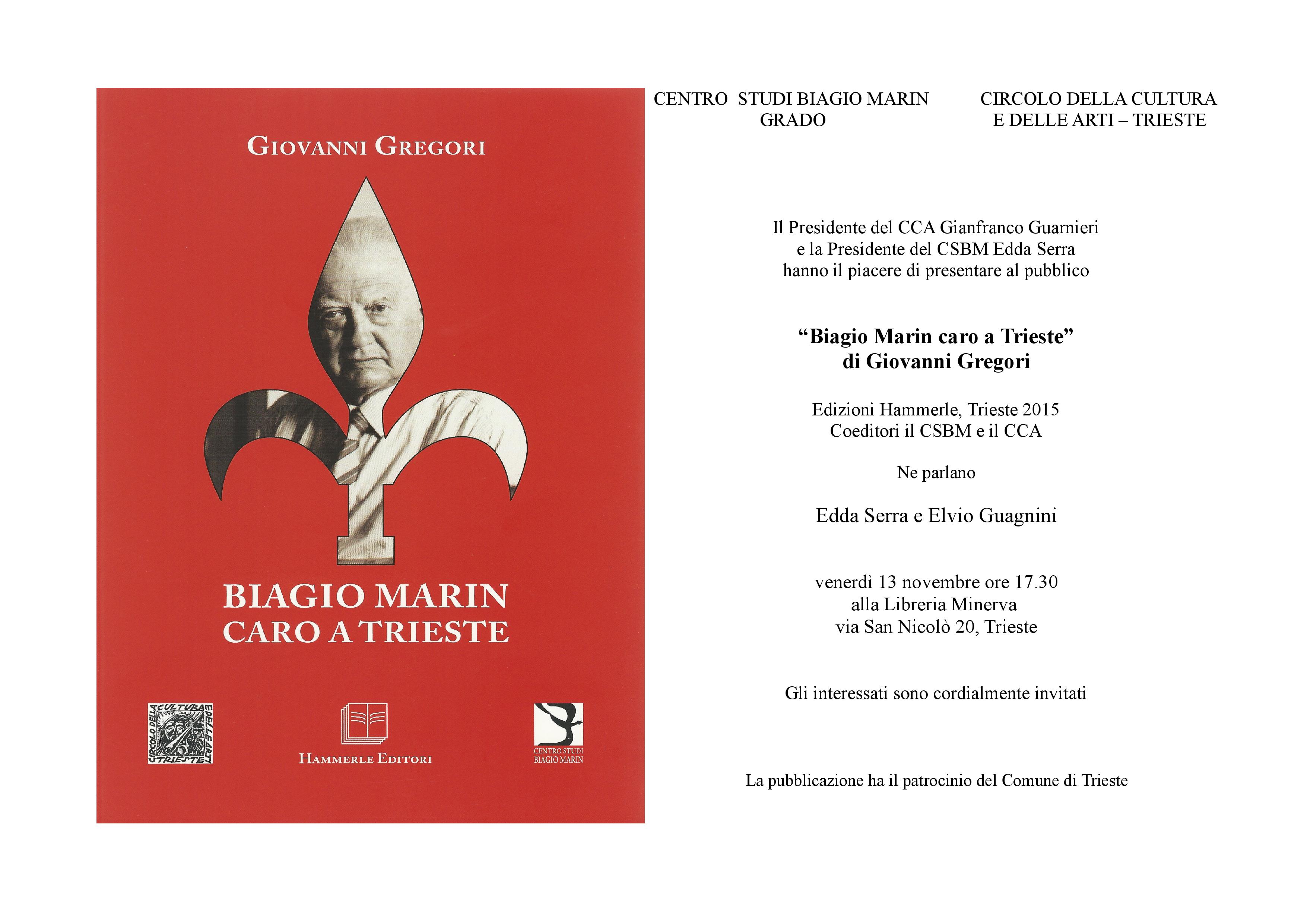 BM caroIl Centro Studi Biagio Marin di Grado e il Circolo della Cultura e delle Arti di Trieste comunicano che sarà nelle librerie dal prossimo martedì 20 ottobre il libro di Giovanni Gregori intitolato “BIAGIO MARIN CARO A TRIESTE” ( Hammerle Editori in Trieste, pp. 255, Euro 15; coeditori il CSBM e il CCA di Trieste ) e incentrato sulla “triestinità” del Poeta di Grado.