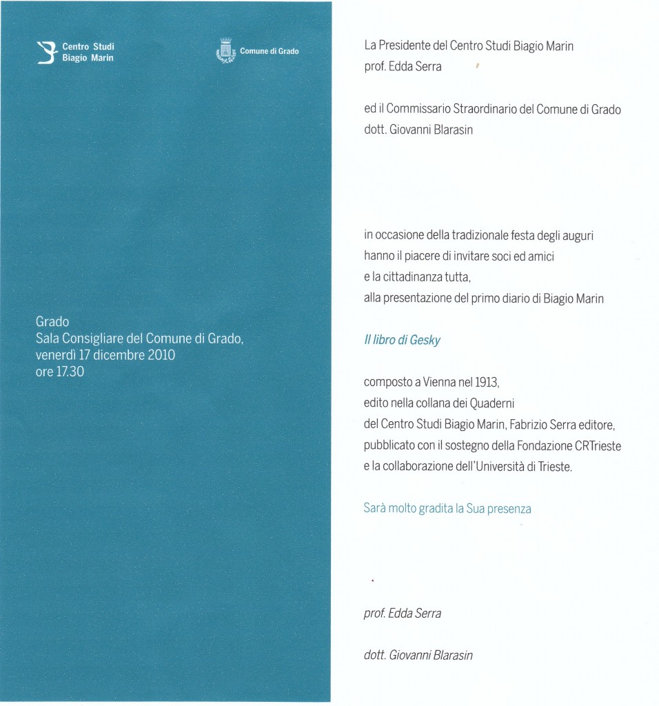 La consueta festa degli auguri che vede raccolti gli amici di Biagio Marin e del Centro Studi ha quest’anno significato e dignità particolari, accanto al Centro Studi, infatti, è il commissario straordinario del Comune di Grado a invitare tutta la cittadinanza, e l’omaggio natalizio sarà la presentazione de “Il libro di Gesky” insieme con la locandina creata da Bruno Chersicla per il libro e per il convegno di Vienna.